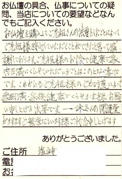 おかげさまで、お客様から大変ありがたいお声をいただきました。これからも、お客様にご安心いただけるように、いい商品をお届けし、まごころを込めたサービスを心がけて参りたいと思います。